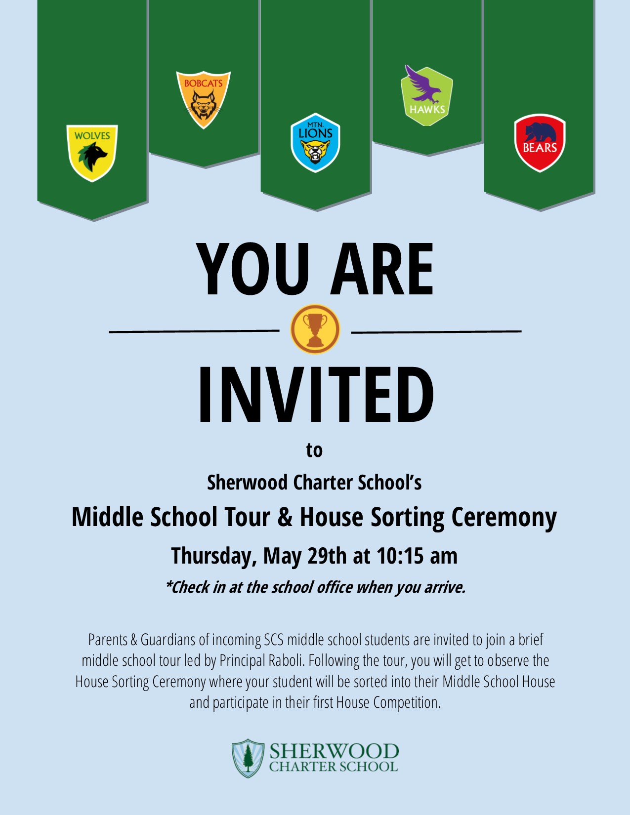 Parents & Guardians of incoming SCS middle school students are invited to join a brief middle school tour led by Principal Raboli on May 29th. Following the tour, you will get to observe the House Sorting Ceremony where your student will be sorted into their Middle School House and participate in their first House Competition.*...